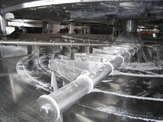 濕物料自加料器連續(xù)地加到干燥器上部第一層干燥盤(pán)上,帶有耙葉的耙臂做回轉(zhuǎn)運(yùn)動(dòng)使耙葉連續(xù)地翻抄物料。物料沿指數(shù)螺旋線流過(guò)干燥盤(pán)表面,在小干燥盤(pán)上的物料被移送到外緣,并在外緣落到下方的大干燥盤(pán)外緣,在大干燥盤(pán)上物料向里移動(dòng)并從中間落料口落入下一層小干燥盤(pán)中。大小干燥盤(pán)上下交替排列,物料得以連續(xù)地流過(guò)整個(gè)干燥器。中間的干燥盤(pán)內(nèi)通入加熱介質(zhì),加熱介質(zhì)形式有飽和蒸汽、熱水和導(dǎo)熱油,加熱介質(zhì)由干燥盤(pán)的一端進(jìn)入,從另一端導(dǎo)出。已干物料從最后一層干燥盤(pán)落到殼體的底層,最后被耙葉移送到出料口排出。濕份從物料中溢出,由設(shè)在頂蓋上的排濕口排出,真空型盤(pán)式干燥器的濕氣由設(shè)在頂蓋上的真空泵口抽出。從底層排出的干物料可直接包裝。通過(guò)配備翅片加熱器、溶劑回收冷凝器、布袋除塵器、干料返混機(jī)構(gòu)、引風(fēng)機(jī)等輔機(jī),可提高其干燥的生產(chǎn)能力,干燥膏糊狀和熱敏性物料,可方便地回收溶劑,并能進(jìn)行熱解和反應(yīng)操作。